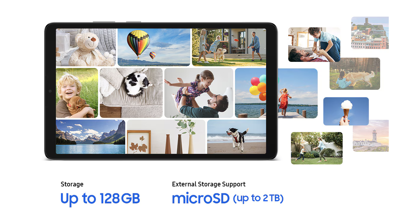 Galaxy Tab A11 mang đến dung lượng bộ nhớ và lưu trữ rộng rãi. Với bộ nhớ đệm lên đến 8 GB, thiết bị cho phép bạn đa nhiệm nhanh chóng, mượt mà, trong khi bộ nhớ 128 GB giúp thoải mái lưu trữ các tệp dung lượng lớn. Ngoài ra, bạn có thể mở rộng dung lượng lên đến 2 TB với thẻ nhớ microSD khi cần