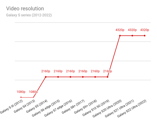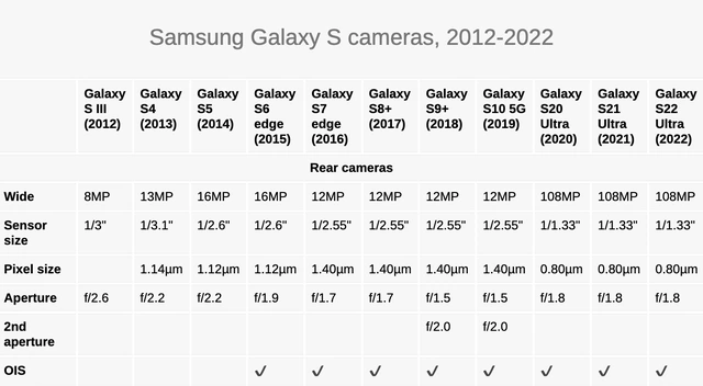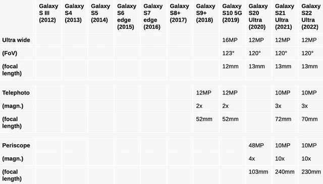Trên thực tế, mãi đến năm 2015, OIS mới xuất hiện trên Galaxy S6. Sau đó, vào năm 2018, Galaxy S9 đã mang ống kính tele đầu tiên vào dòng sản phẩm, Galaxy S10 5G năm sau đó đã bổ sung thêm một camera góc siêu rộng.
