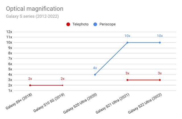Galaxy S20 Ultra có ống kính tiềm vọng với tiêu cự 103mm, zoom quang học 4x. Con số này cao gấp đôi so với những gì mà các ống kính tele trước đây cung cấp, nhưng nó tạo ra khoảng cách quá rộng để cảm biến chính có thể lấp đầy bằng zoom kỹ thuật số. Vì vậy, với Galaxy S21 Ultra trở đi, Samsung đã sử dụng cả ống kính tele tiêu chuẩn (hiện là 3x) và kính tiềm vọng.