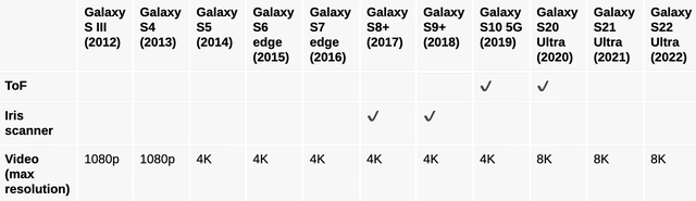 Một xu hướng tồn tại ngắn hạn khác là cảm biến quét mống mắt ở mặt trước. Cảm biến này được sử dụng để xác thực sinh trắc học, nhưng đã bị loại bỏ trong thế hệ S10 khi Samsung chuyển sang cảm biến vân tay dưới màn hình.