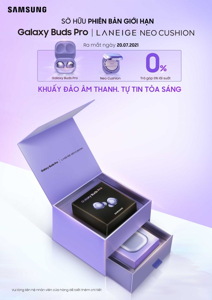 Thương hiệu mỹ phẩm chăm sóc da cao cấp LANEIGE giới thiệu sản phẩm phấn nước NEO Cushion Phantom Violet phiên bản giới hạn hợp tác cùng hợp tác với Samsung’s Galaxy Buds Pro. Dự án này được khơi nguồn cảm hứng từ thiết kế hình vuông bo tròn của cả Samsung Galaxy Buds Pro và LANEIGE NEO Cushion